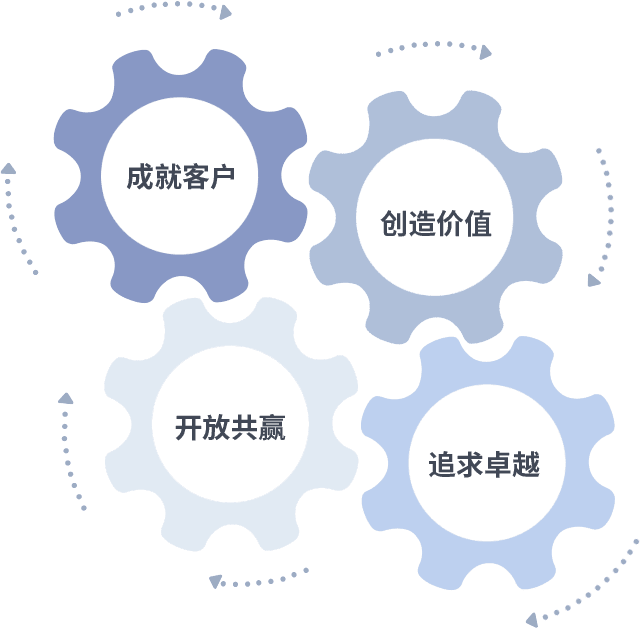 成就客户是一切决策的出发点,,创造价值是衡量所有工作的标准,,追求卓越是我们做事做人的态度,,,开放共赢是我们的格局也是最终的结果。。价值观的齿轮环环相扣,,推动着组织里的每个人不断向前。。。