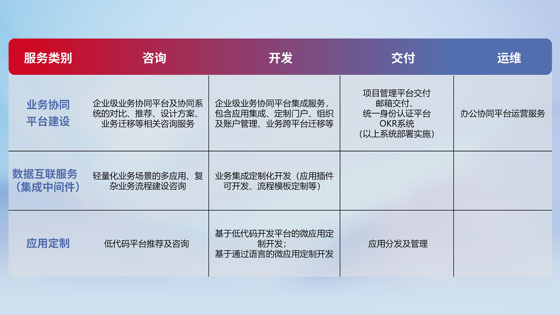 针对钉钉、、、、企微、、、IDaas等平台级产品提供产品的规划、、、方案、、、交付、、、、定制化开发等服务,,实现如统一协同办公、、、智能客户服务、、、、混合会议管理、、智能数据查询、、、、等业务场景,,实现数字化转型。。。。